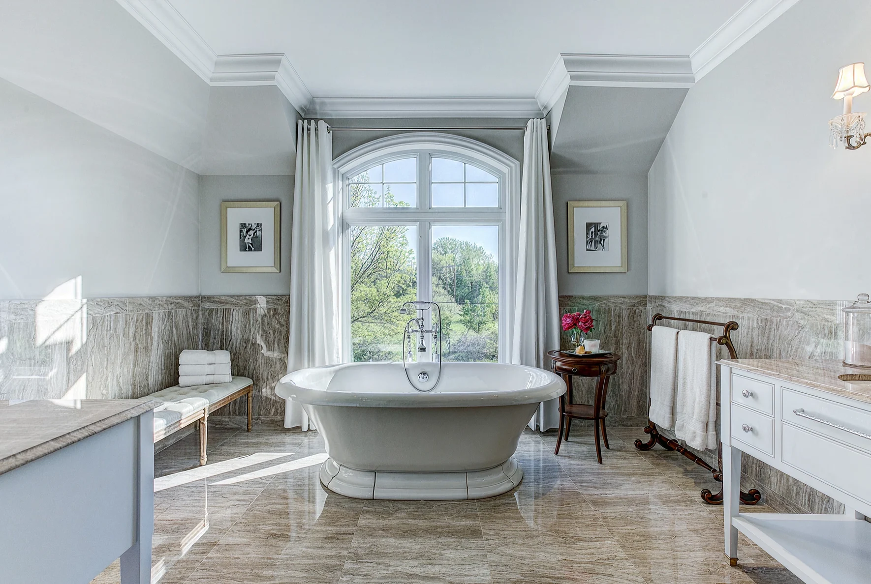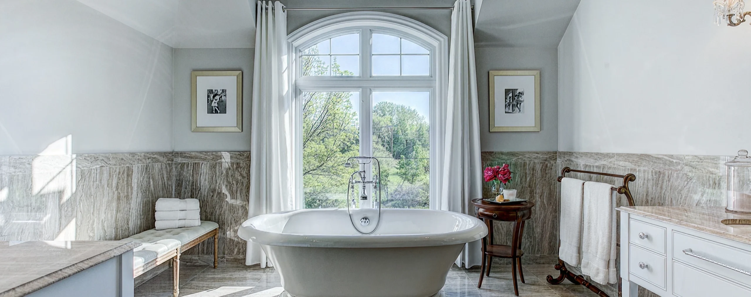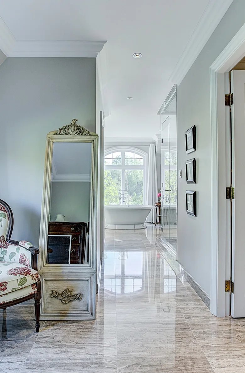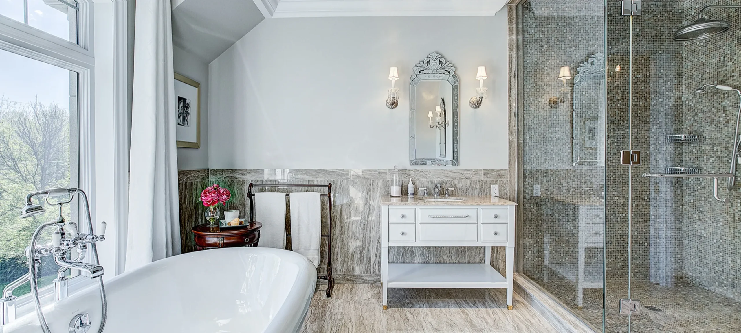 De belles dimensions, cette salle de bain principale évoque la sobriété et l’élégance des grands hôtels. Le marbre et la mosaïque en pâte de verre apportent une touche intemporelle à cet espace soigné, conçu pour durer. Un projet réalisé par notre équipe de la Rive-Sud de Montréal, reconnue pour la qualité de ses travaux, qu’il s’agisse de projets haut de gamme ou plus modestes.